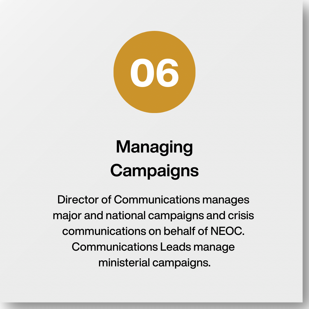 Communications supports effective policy creation and implementation in six main areas: